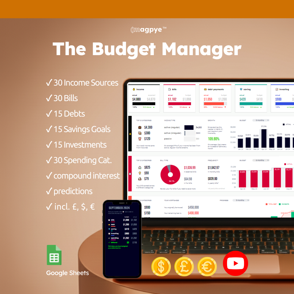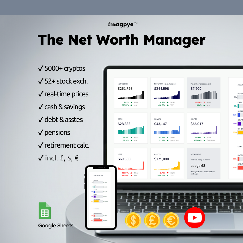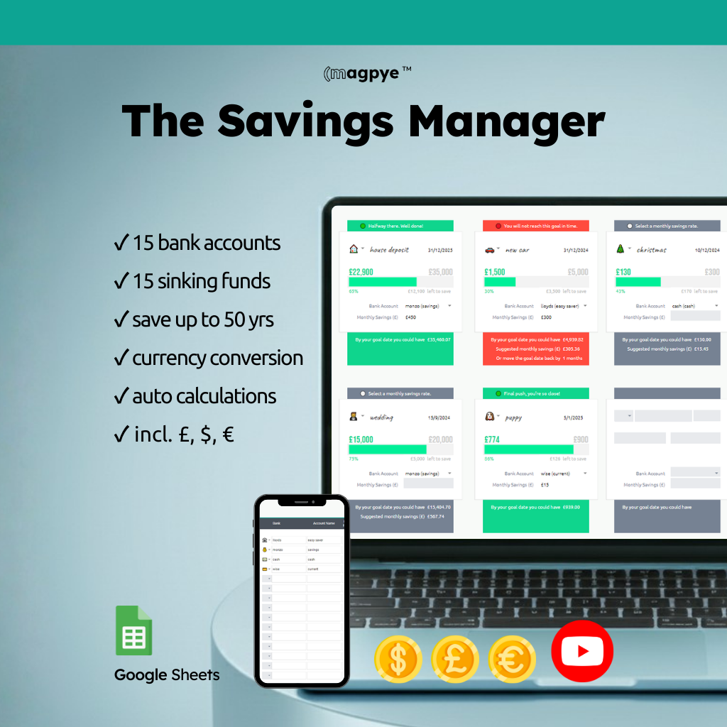 Build your savings with confidence using our Savings Manager or our Net Worth Manager. Whether you’re saving for a vacation, an emergency fund, or a big purchase, our spreadsheet helps you set goals, monitor your progress, and stay motivated.